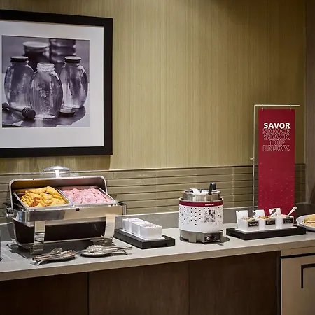 A hot hot buffet breakfast is served with porridge, waffles, and fresh fruits. Sample American specialties at B&B Taps & Grill located just around the corner from the Hampton.